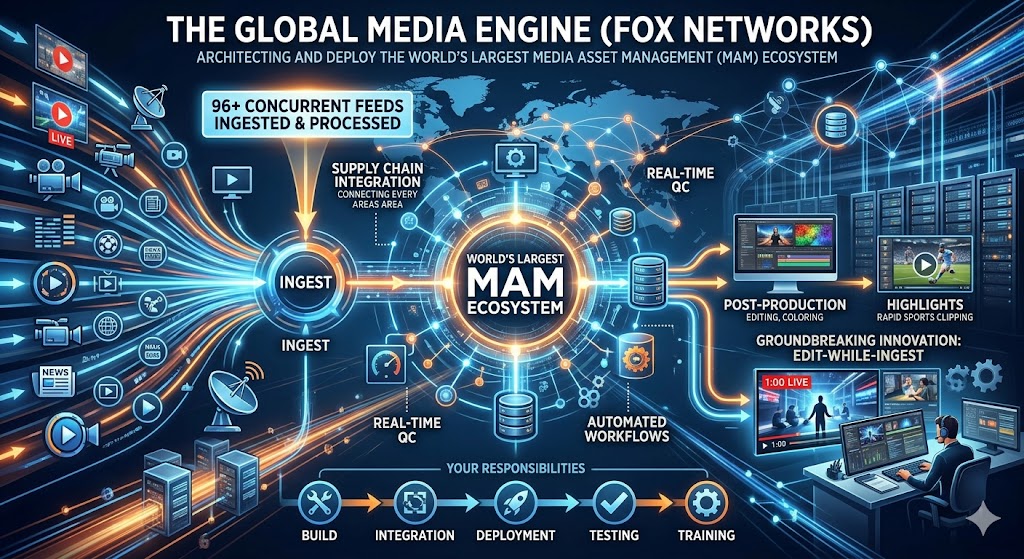 Stack: Enterprise MAM, Multi-System Integration, Real-time Ingest/QC, Workflow Engineering.